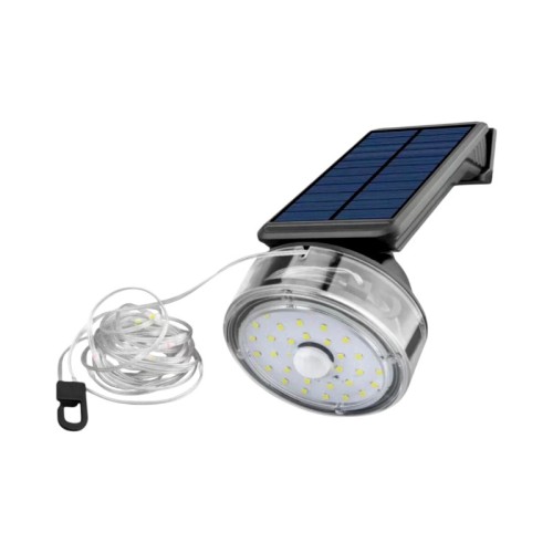 Ηλιακός προβολέας LED με αισθητήρα κίνησης και ενσωματωμένη γιρλάντα φωτισμού 5 μέτρων με πολύχρωμο φωτισμό RGB και ευρεία γωνία φωτισμού.