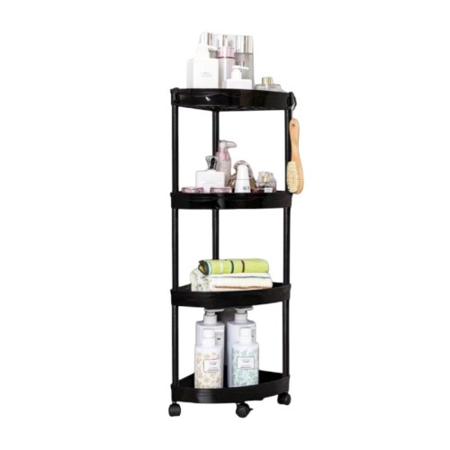 Πολυχρηστική πλαστική ραφιέρα μπάνιου 4 επιπέδων, γωνιακή, με ρόδες για εύκολη μετακίνηση. Διαστάσεις: 90 x 34 x 25 cm. Ύψος ραφιών: 28cm.