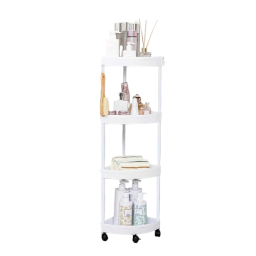 Πολυχρηστική πλαστική ραφιέρα μπάνιου 4 επιπέδων, γωνιακή, με ρόδες για εύκολη μετακίνηση. Διαστάσεις: 90 x 34 x 25 cm. Ύψος ραφιών: 28cm.
